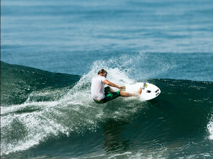 …and just what is the inverted fulcrum all about? A shift in the rocker of the board at its center point; the place where it rocks back and forth; the point where it pendulates – I like to call it the spot that generates the speed like a swiveling ball-bearing rhythm slingshotting you down the line. The inverted fulcrum takes an existing curve and creates a little kink or dip just ahead of the center point along the bottom. This shifts all the points on that curve down in the front half and up in the back half…which gives you a feeling like a skateboard always headed on the downslope. Constant steady drive through the dead spots, increased paddling ease, and a quicker, tighter radius arc on the wave face; i.e. Steeper and deeper through maneuvers. I’m finding that the “bumps” and “dips” and seeming irregularities in the rocker curves, if placed in the right spots, actually jibe with the wave better and project your board cross-grain to the natural gravity pull of the wave face…and that’s just where we all wanna be. Quicker, faster, easier. Let gravity work in your favor; invert the paradigm, shift the status quo; the future and the now are poles apart.